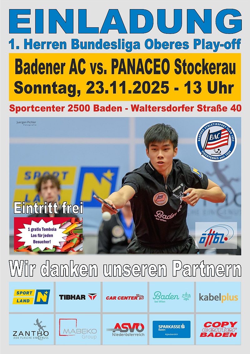 Im Namen des Badener AC-Tischtennis – dem ältesten Tischtennisverein der Welt – und der Österreichischen Tischtennis Bundesliga laden wir euch sehr herzlich zu unserem nächsten und letzten Heimspiel der Herbstrunde nach Baden ein.